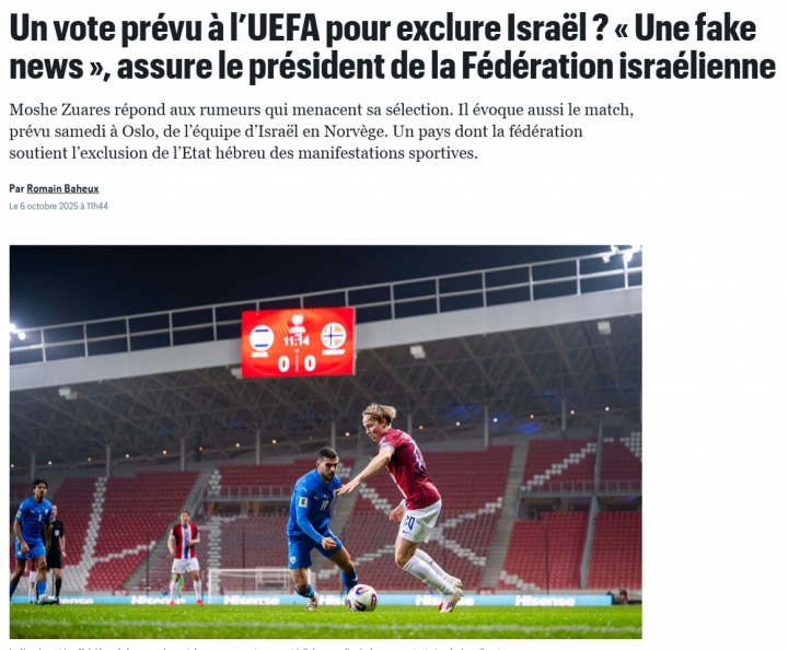 北京时间10月12日,世预赛欧洲区小组赛I组第7轮,挪威将在主场迎战以色列。在这场重要的比赛前,关于欧足联是否会进行投票以排除以色列的传闻引发了广泛关注。针对这一不实报道,以色列足协主席摩西·祖阿雷斯作出了明确回应,称这一说法完全是虚假信息。
